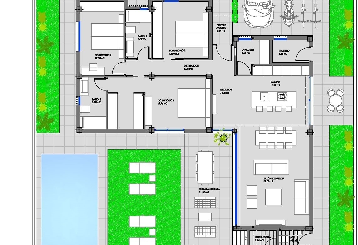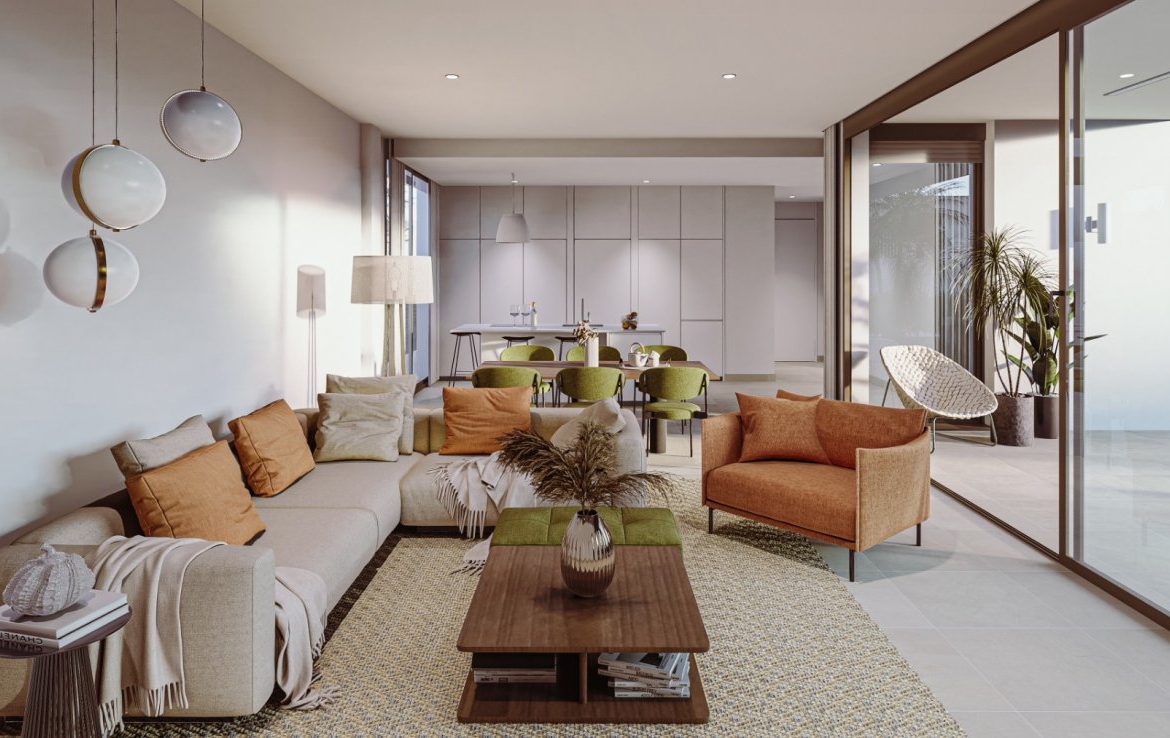 Las villas tienen una moderna cocina abierta con la sala de estar, donde las altas ventanas correderas tiene acceso al jardín con piscina privada y plaza de aparcamiento.